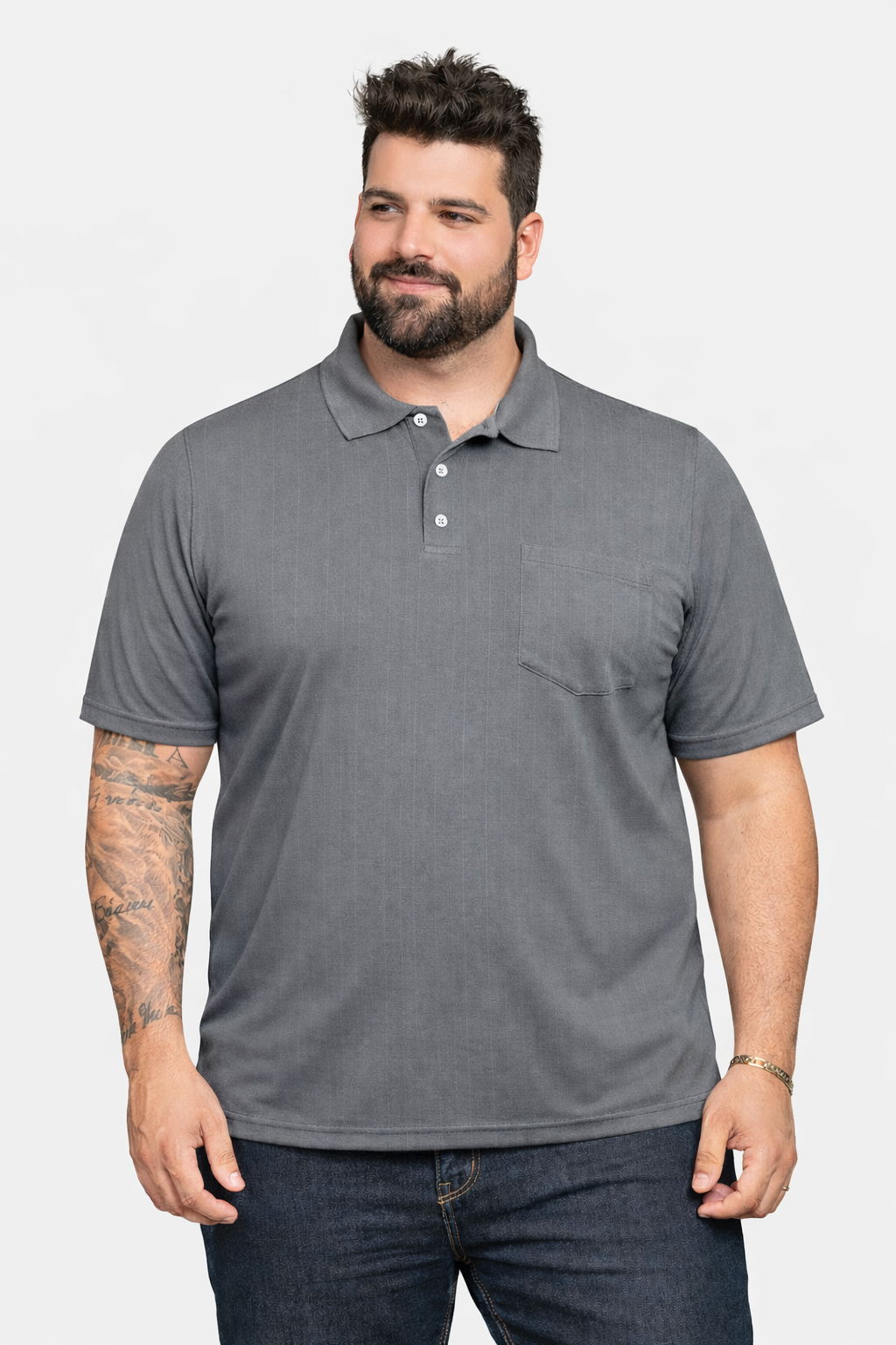 Polo masculina Tony Menswear com bolso confeccionada em malha macia devido a composição com viscose (67% poliéster 33%viscose). Modelagem ampla, estilo senhor, mangas mais compridas e tronco mais largo. ATENÇÃO PARA AS MEDIDAS.